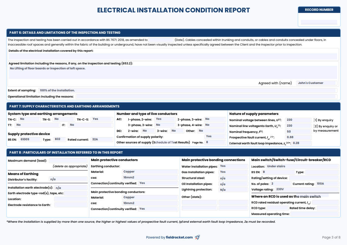 This part of the report is to verify whether the electrical supply characteristics are suitable for the building, and that the earthing and bonding arrangements adhere to safety standards. Simply record your observations in the relevant fields.