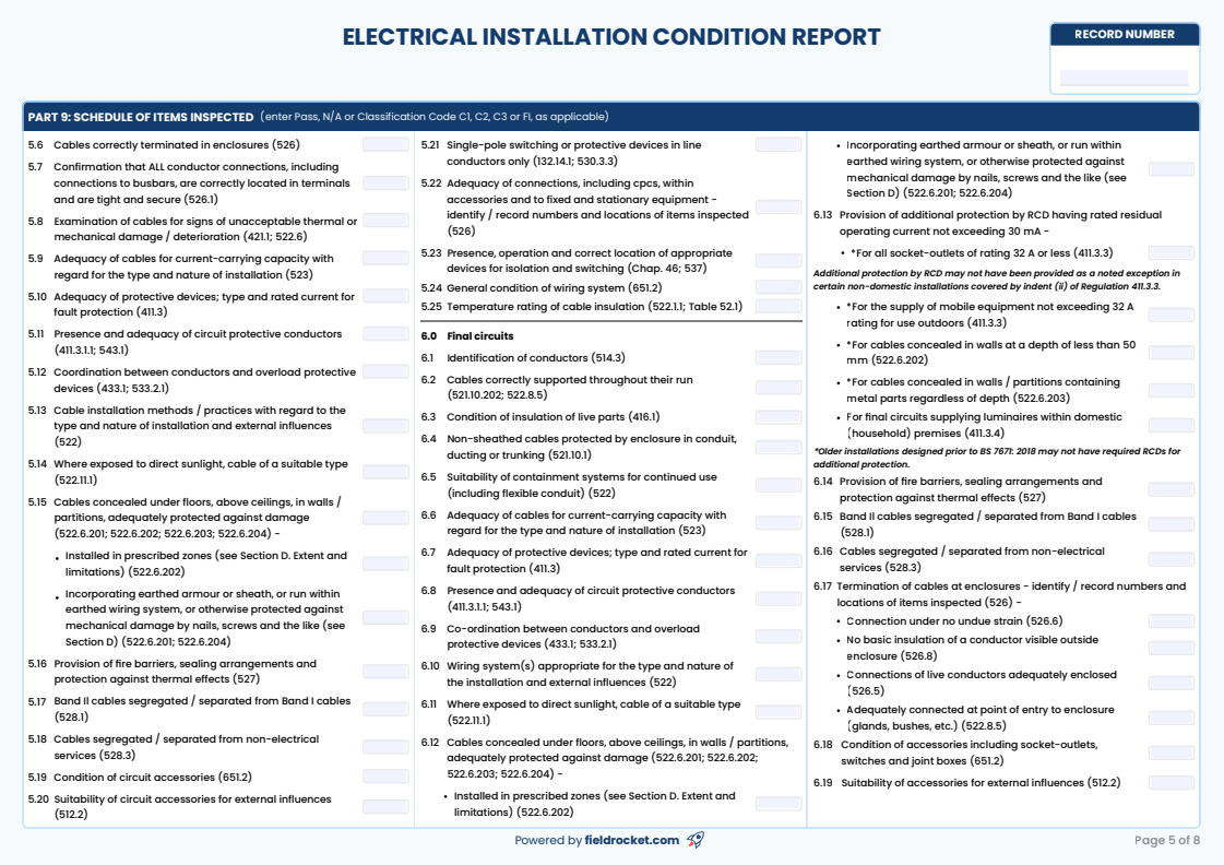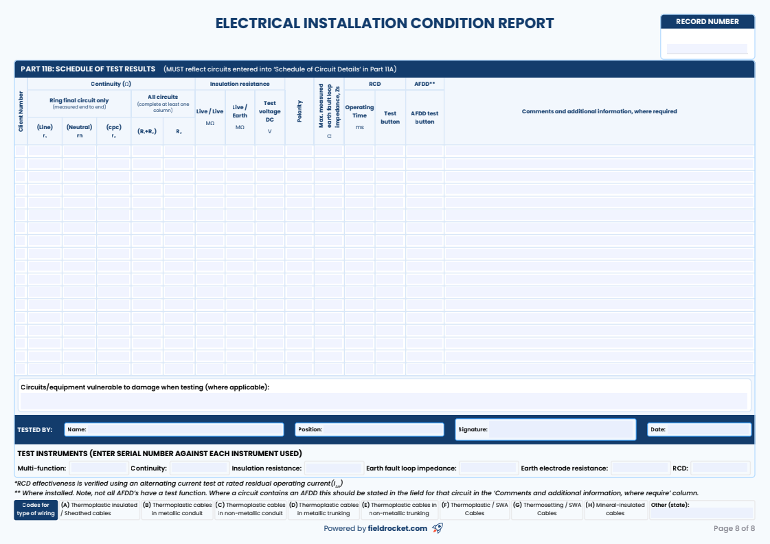 Codes for the type of wiring can be found on the certificate itself. If you create your EICR with FieldRocket or use our template PDF, you’ll find it on page 8 beneath the Schedule Of Test Results.