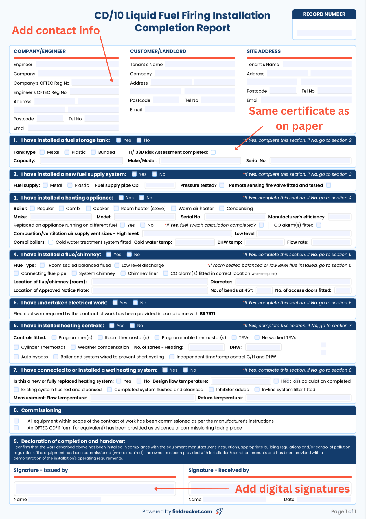 A CD10 oil form is used as a record for the installation of an oil appliance. A completed record will provide details on the oil storage system, appliance details, flueing arrangements, control details, and much more.