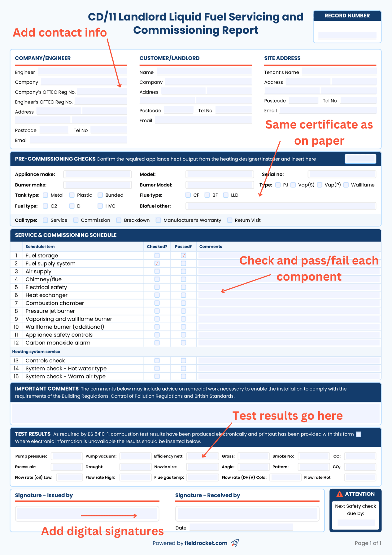 CD11 Oil Firing Servicing and Commissioning Reports, are an important document for both you and your customer. Here’s what’s on our template:
