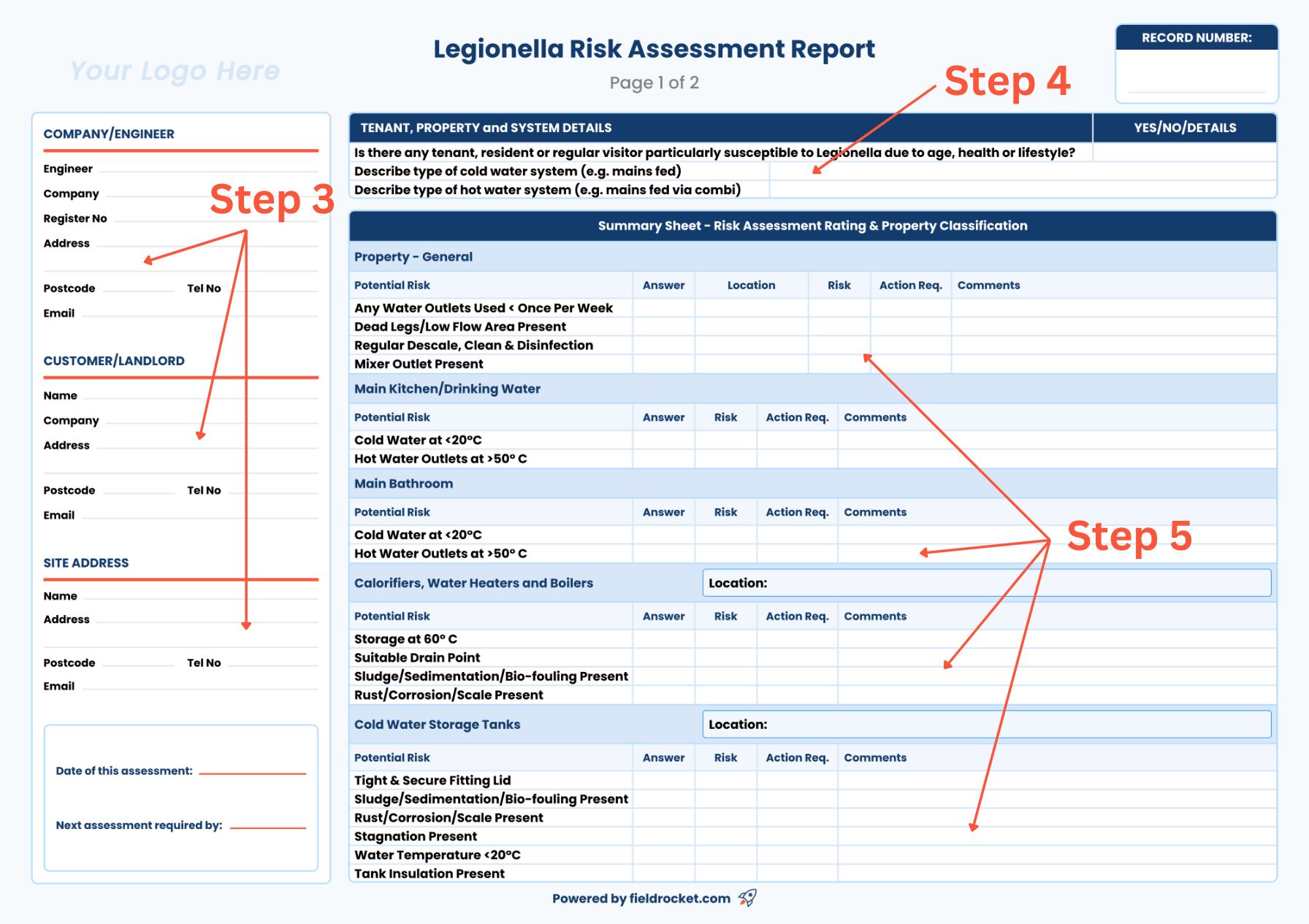 To provide evidence of a easy, thorough, and complete risk assessment, FieldRocket’s Legionella certificate includes fillable fields for: